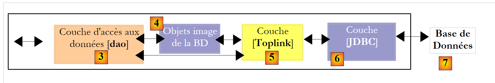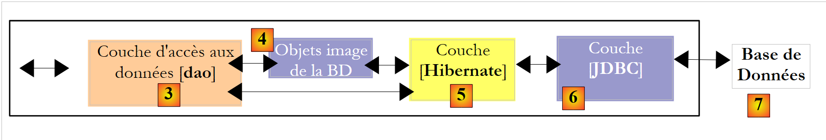 La couche [4] des objets, image de la BD est appelée "contexte de persistance". Une couche [dao] s'appuyant sur Hibernate fait des actions de persistance (CRUD, create - read - update - delete) sur les objets du contexte de persistance, actions traduites par Hibernate en ordres SQL. Pour les actions d'interrogation de la base (le SQL Select), Hibernate fournit au développeur, un langage HQL (Hibernate Query Language) pour interroger le contexte de persistance [4] et non la BD elle-même.