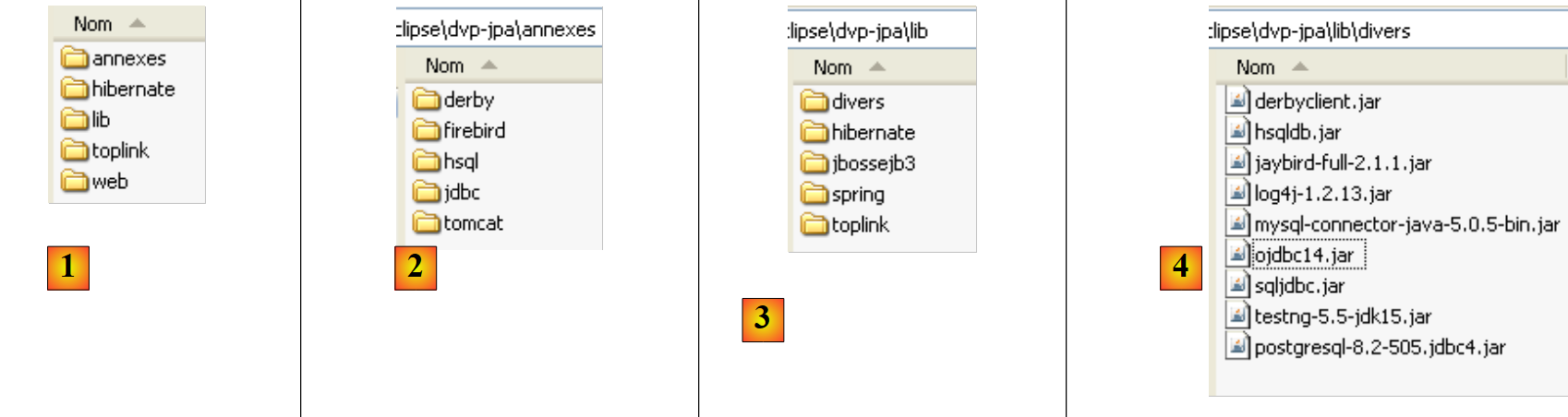 - en [4] : le dossier <lib/divers> regroupe les archives : - des pilotes Jdbc des SGBD - de l'outil de test unitaire [testNG] - de l'outil de logs [log4j]