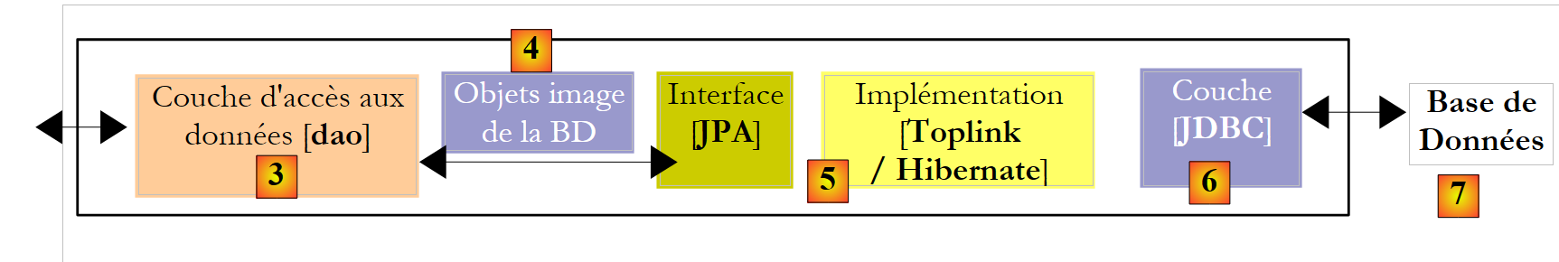 De multiples efforts ont été faits pour faciliter l'écriture des ces différentes couches par les développeurs. Parmi ceux-ci, JPA vise à faciliter l'écriture de la couche [dao], celle qui gère les données dites persistantes, d'où le nom de l'API (Java Persistence Api). Une solution qui a percé ces dernières années dans ce domaine, est celle d'Hibernate :