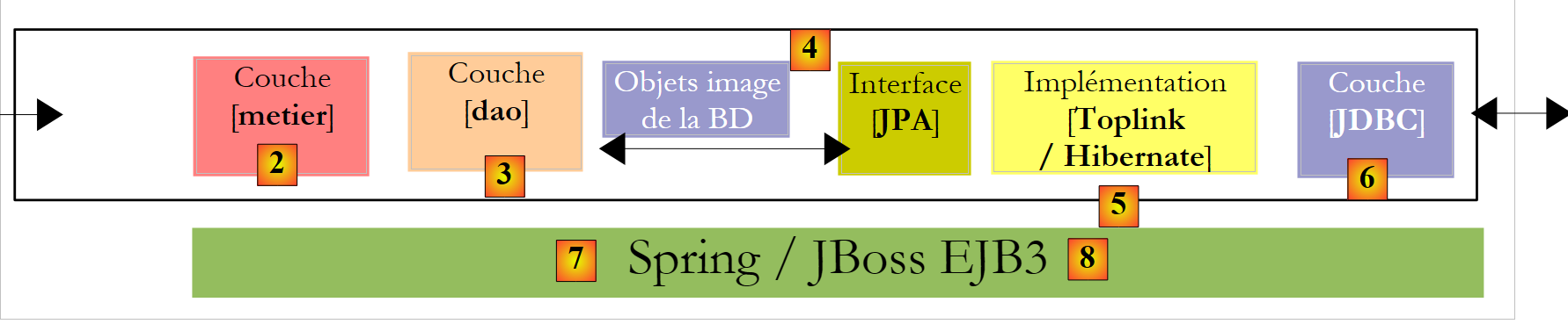 La couche [JPA] sera accédée via une architecture à 2 couches [metier] et [dao]. Le framework Spring [7], puis le conteneur EJB3 de JBoss seront utilisés pour lier ces couches entre-elles.