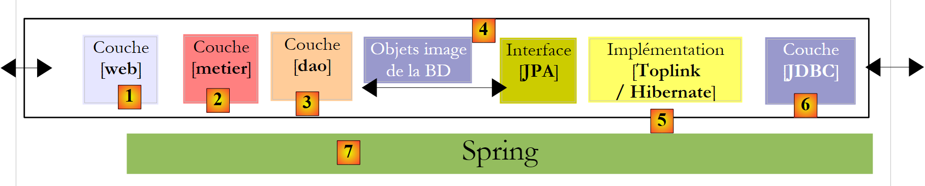 - avec Spring, les couches seront implémentées avec des POJOs. Ceux-ci auront accès aux services de Spring (pool de connexions, gestionnaire de transaction) par injection de dépendances dans ces POJOs : lors de la construction de ceux-ci, Spring leur injecte des références sur les services dont il vont avoir besoin.