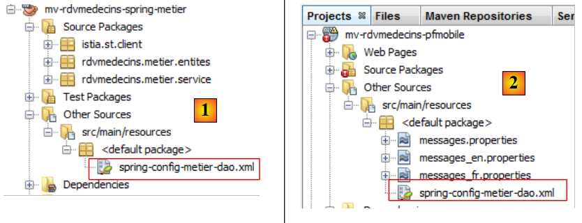- lignes 20-21 : instanciation de la couche [métier] à partir du fichier de configuration de Spring. Ce fichier est celui utilisé par la couche [métier] [1]. Nous le copions dans le projet web [2] :