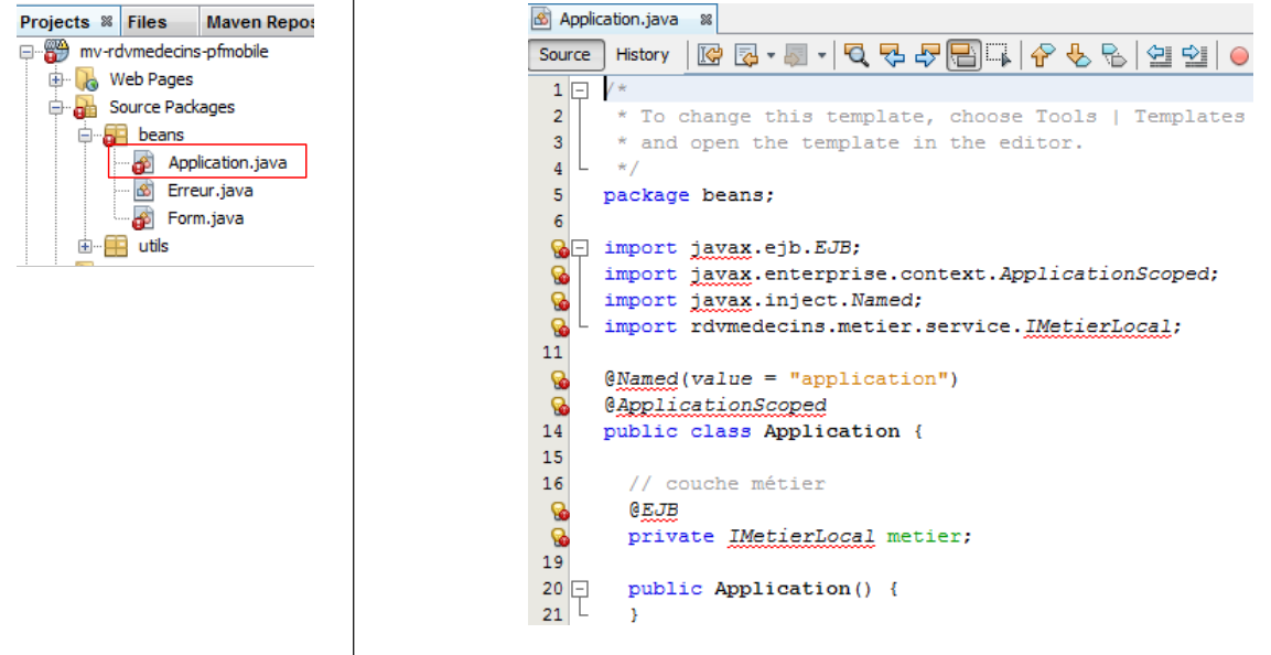 Des erreurs apparaissent. Elles sont dues aux références EJB de la couche [web]. Etudions d'abord le bean [Application] :