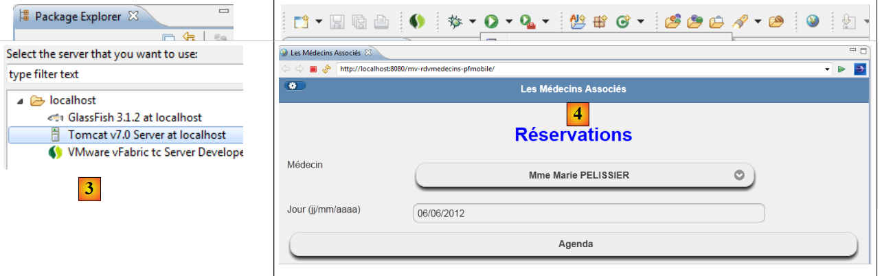 Nous choisissons le serveur Tomcat [3]. La page d'accueil de l'application est alors affichée dans le navigateur interne d'Eclipse [4].