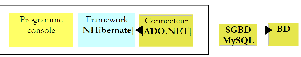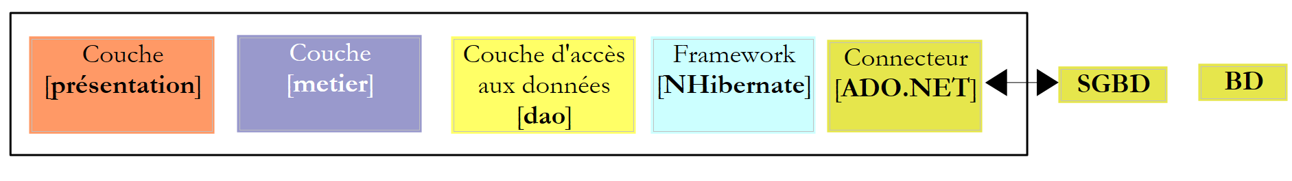 La couche [dao] est ainsi dépendante du SGBD utilisé. Certains frameworks (Linq, Ibatis.net, NHibernate) lèvent cette contrainte en ajoutant une couche supplémentaire entre la couche [dao] et le connecteur [ADO.NET] du SGBD utilisé. Nous utiliserons ici, le framework [NHibernate].