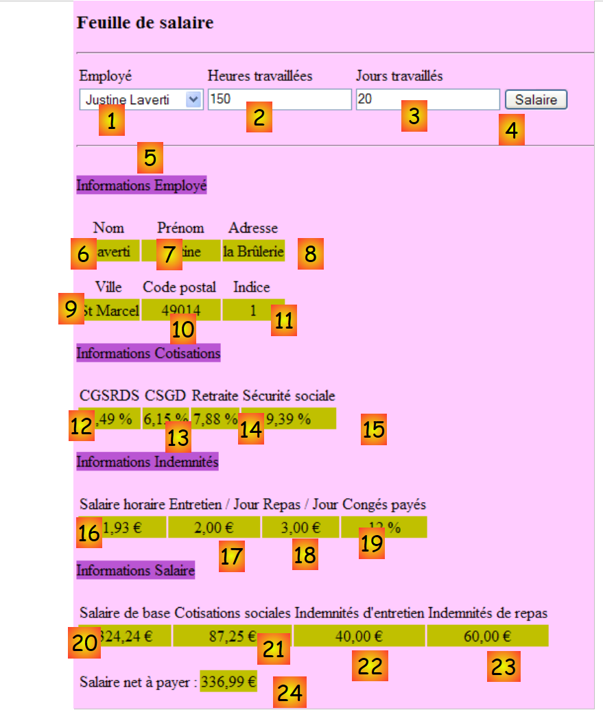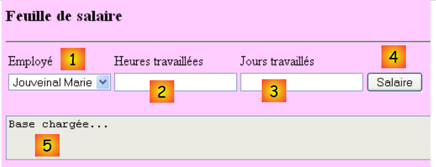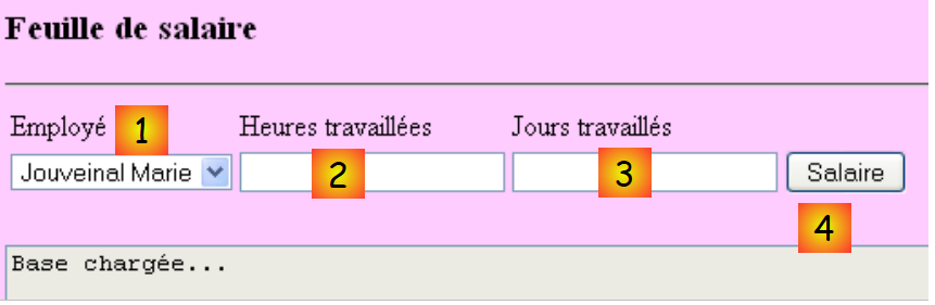 Ce gestionnaire commence par vérifier la validité des saisies faites en [2] et [3]. Si l'une des deux est incorrecte, l'erreur est signalée comme il a été montré précédemment. Une fois les saisies [2] et [3] vérifiées et trouvées valides, l'application doit afficher des données complémentaires sur l'utilisateur sélectionné en [1] ainsi que son salaire (cf copie d'écran paragraphe 4.1).
