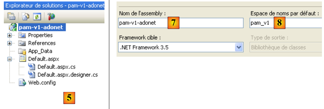 - en [8], l'espace de noms par défaut que nous souhaitons avoir pour les classes du projet. La classe [_Default] définie dans les fichiers [Default.aspx.cs] et [Default.aspx.designer.cs] a elle été créée dans l'espace de noms [pam_v1_adonet] dérivé du nom du projet. On peut changer cet espace de noms directement dans le code de ces deux fichiers :