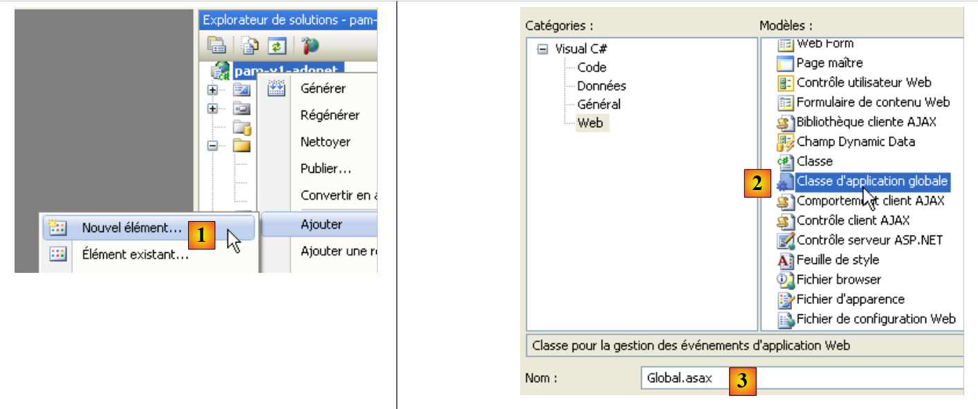 - en [2], on ajoute la classe d'application globale qui s'appelle par défaut [Global.asax] [3]
