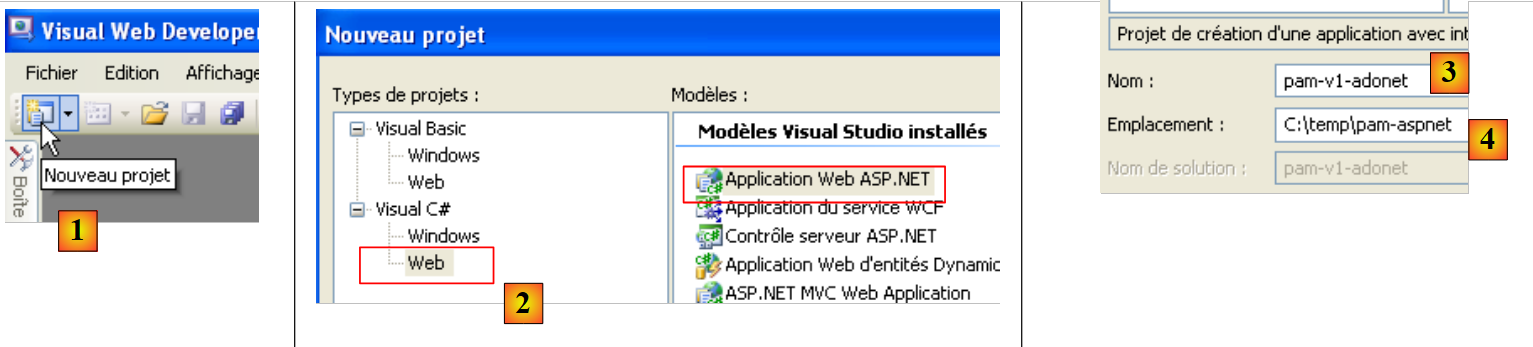 - en [4], on précise son nom et en [5] son emplacement. Un dossier [c:\temp\pam-aspnet\pam-v1-adonet] va être créé pour le projet.