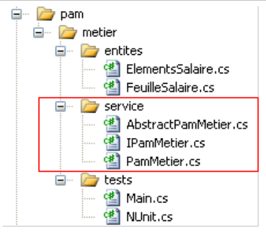 Une fois écrite et testée la classe [PamMetier], on génèrera la DLL [pam-metier-dao-nhibernate.dll] de la couche [metier] en suivant la méthode décrite au paragraphe 7.3.5 On prendra soin de ne pas inclure dans la DLL les programmes de test [Main.cs] et [NUnit.cs]. On la placera ensuite dans le dossier [lib] des DLL [1].