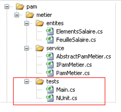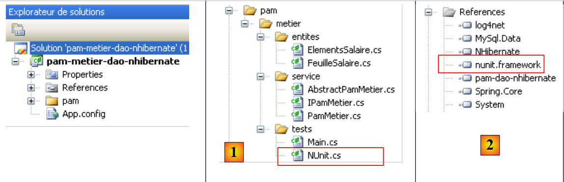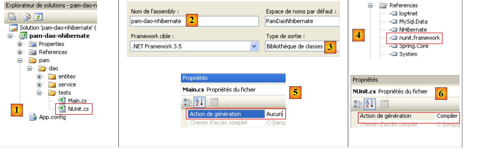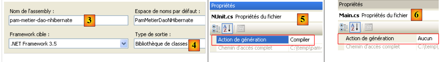 - en [5], le fichier [NUnit.cs] sera inclus dans l'assembly [pam-metier-dao-nhibernate.dll] mais pas [Main.cs] [6]