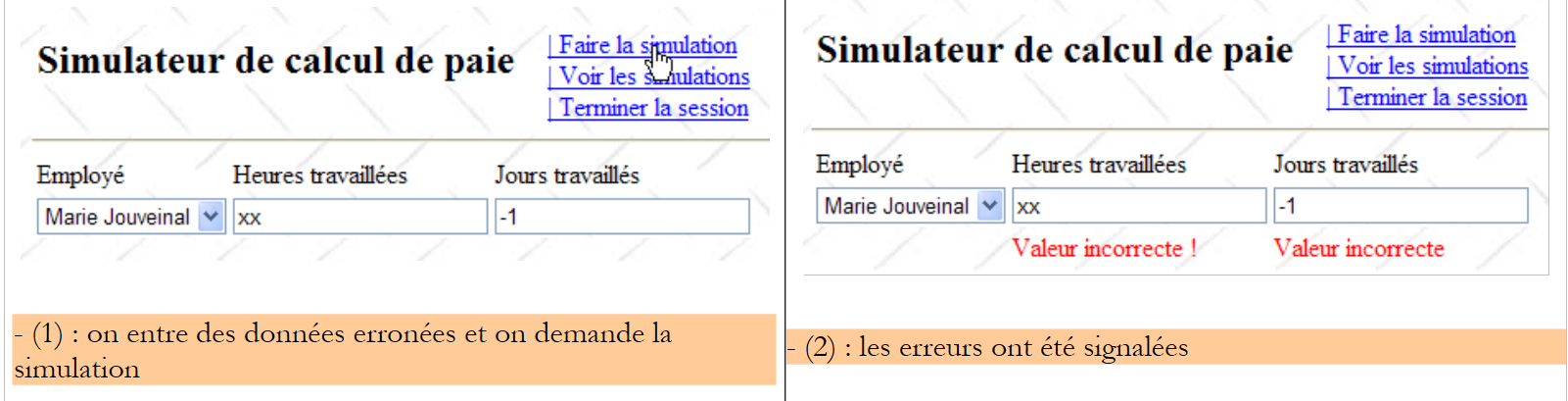 On notera que l'écran (2) présente le formulaire tel qu'il a été saisi. Il faut se rappeler ici que ces différentes vues appartiennent à une même page. Entre les différentes requêtes, les valeurs des composants sont maintenues par le mécanisme du ViewState si ces composants ont leur propriété EnableViewState à true.