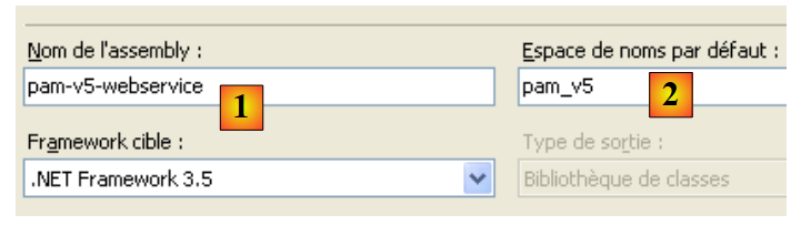 - en [3], dans les propriétés du projet, le nom de l'assembly, la deuxième information nécessaire à la configuration de l'objet Spring [pammetier].