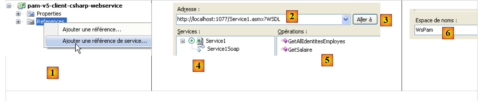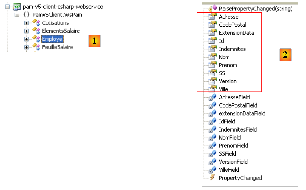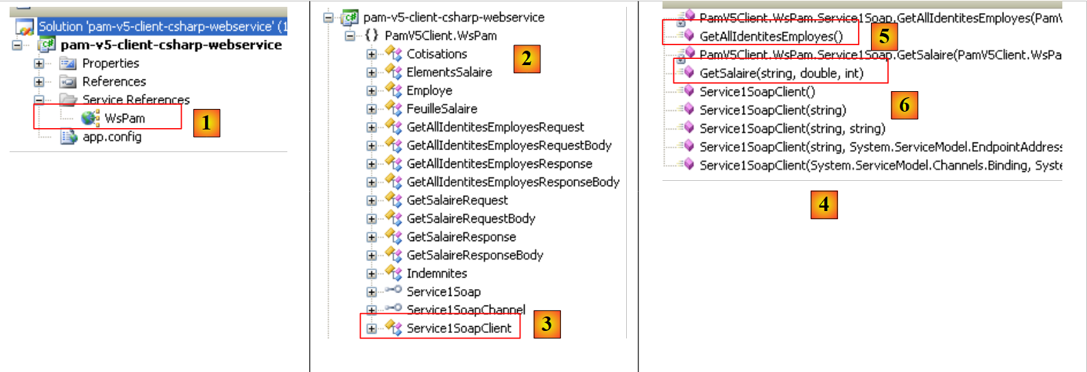 - en [2], dans l'explorateur d'objets, les classes et interfaces de l'espace de noms Client.WsPam sont affichées. C'est l'espace de noms du client généré.