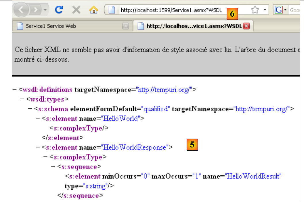 - en [5], le contenu du fichier WSDL obtenu via le lien [3]. On notera l'URL [6]. Sa connaissance est nécessaire aux clients du service web.