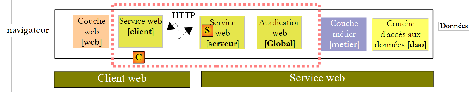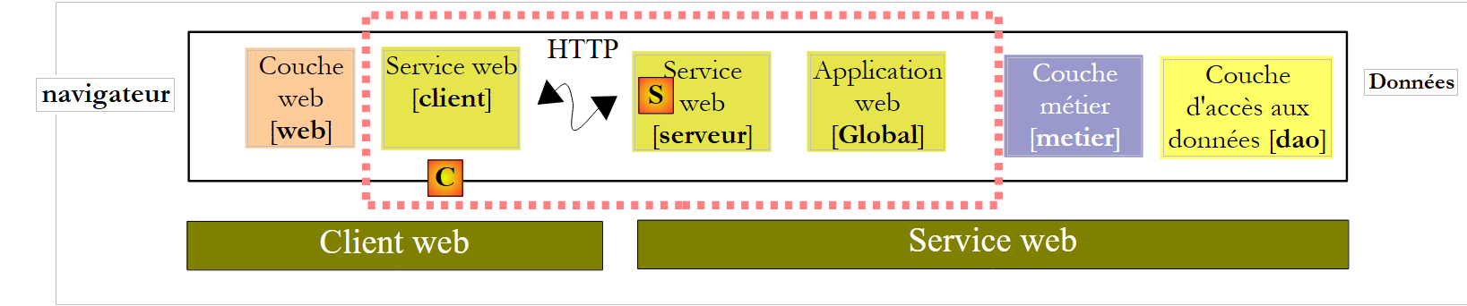 - la couche client [C] transmet, de façon transparente pour la couche [web], les requêtes de celle-ci au service web distant [S]. Elle prend en charge tout l'aspect "communication réseau". Elle reçoit une réponse du service web distant qu'elle met en forme pour la rendre à la couche [web] sous la forme que celle-ci attend.