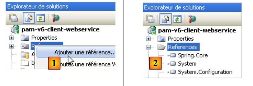 Les erreurs d'espace de noms 1, 2, 4, 5, 6, 7 vont être résolues par la génération du client C du service web. L'erreur 3 est résolue en ajoutant au projet une référence sur la DLL de Spring. Nous pouvons procéder comme suit :