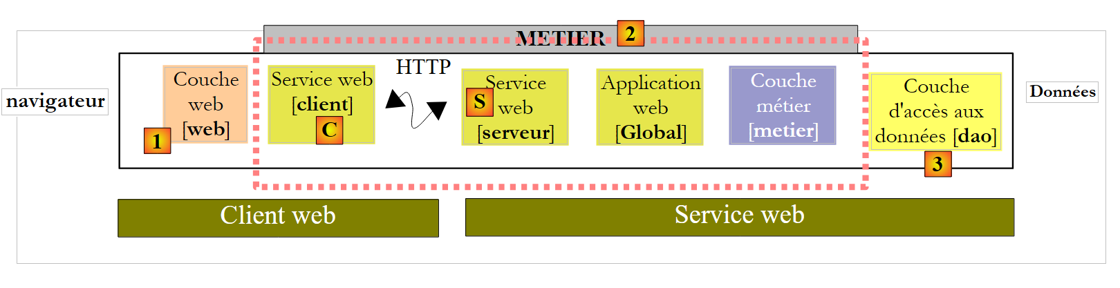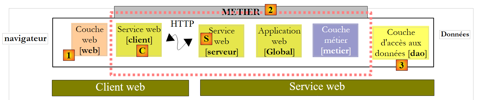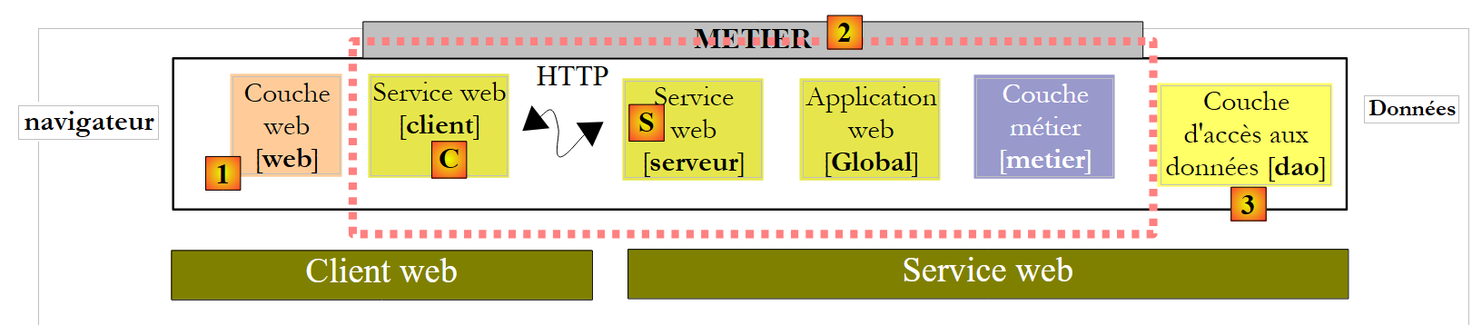 Le projet [pam-v6-client-webservice] est la couche [web] [1] dans le schéma ci-dessus. On voit que cette couche communique avec le client [C] du service web, un client que nous allons générer prochainement.