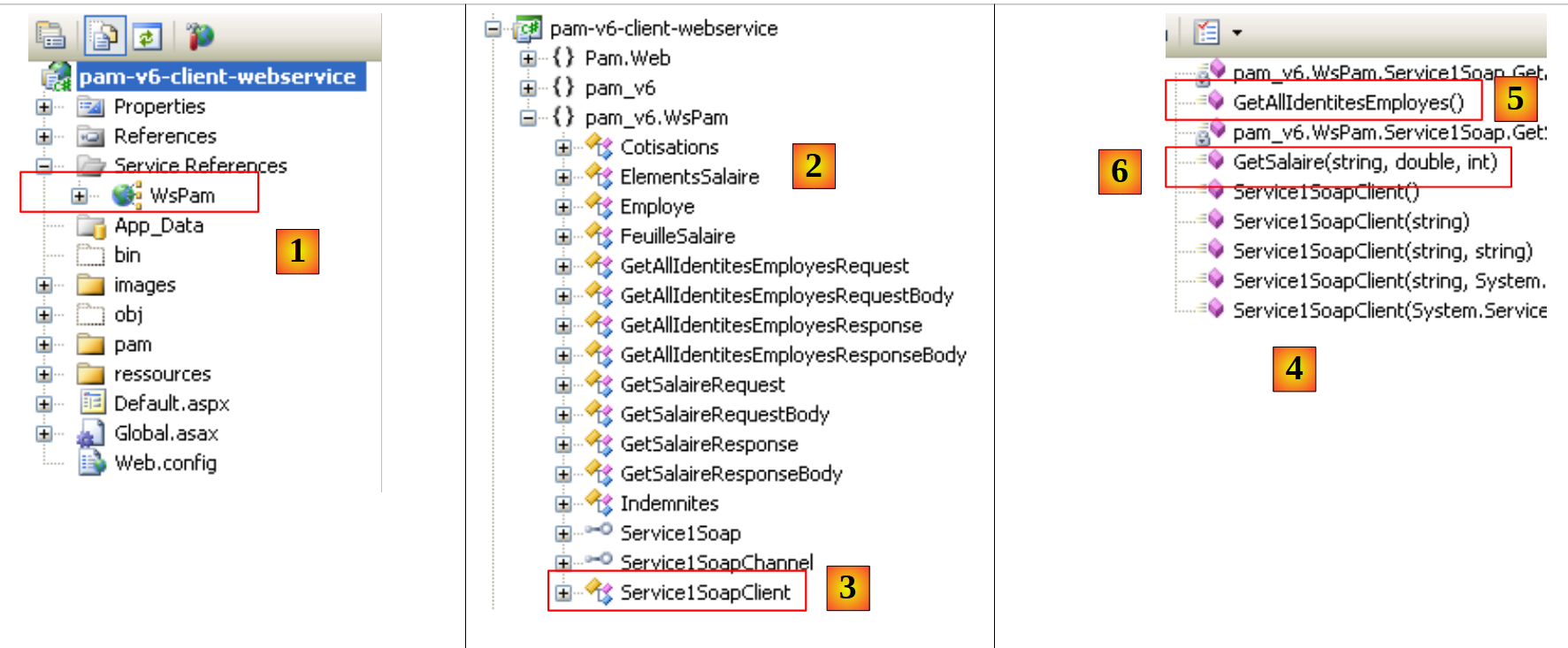 - en [2], dans l'explorateur d'objets, les classes et interfaces de l'espace de noms pam_v6.WsPam sont affichées. C'est l'espace de noms du client généré.