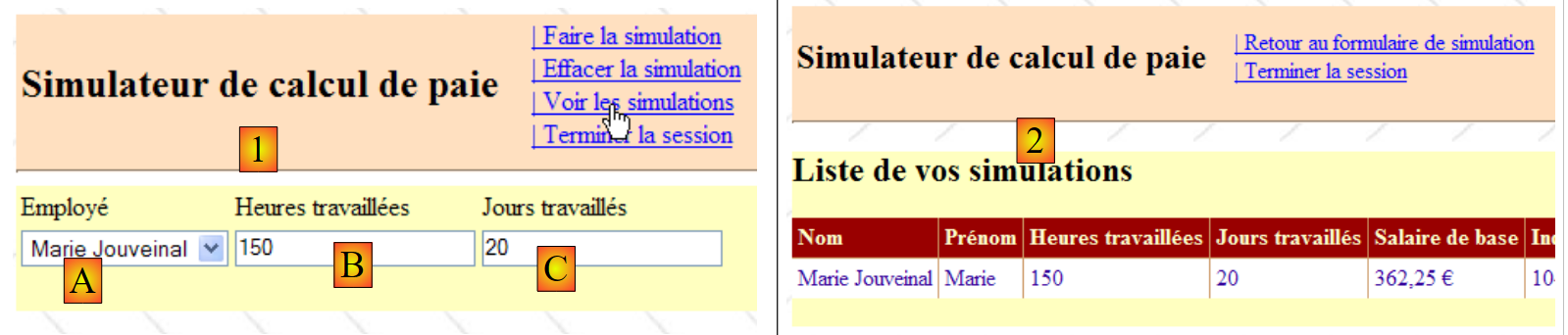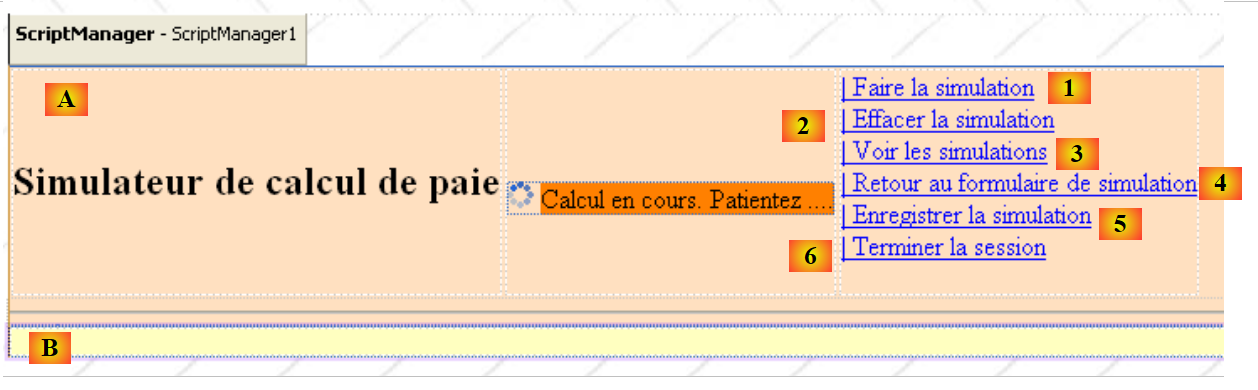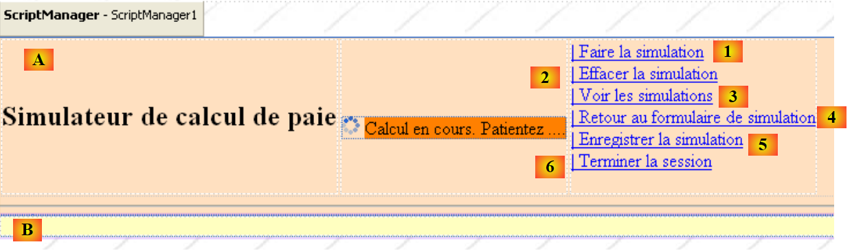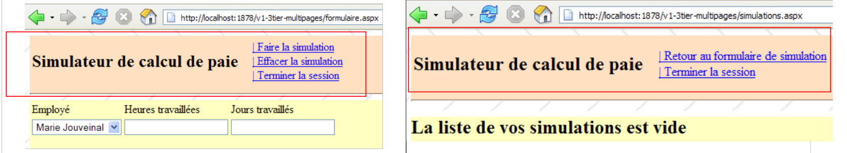 Les vues de l'application présentées au paragraphe 11.1, ont des parties communes qu'on peut factoriser dans une page Maître, appelée la Master Page dans Visual Studio. Prenons par exemple, les vues [VueSaisies] et [VueSimulationsVides] ci-dessous, générées respectivement par les pages [Formulaire.aspx] et [Simulations.aspx] :