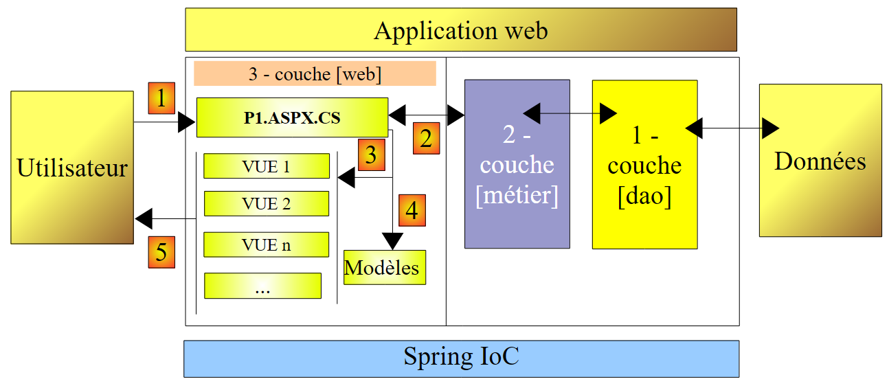 - la page P1 traite cette demande. Pour ce faire, elle peut avoir besoin de l'aide de la couche [métier] (2) qui elle-même peut avoir besoin de la couche [dao] si des données doivent être échangées avec la base de données. L'application reçoit une réponse de la couche [métier].