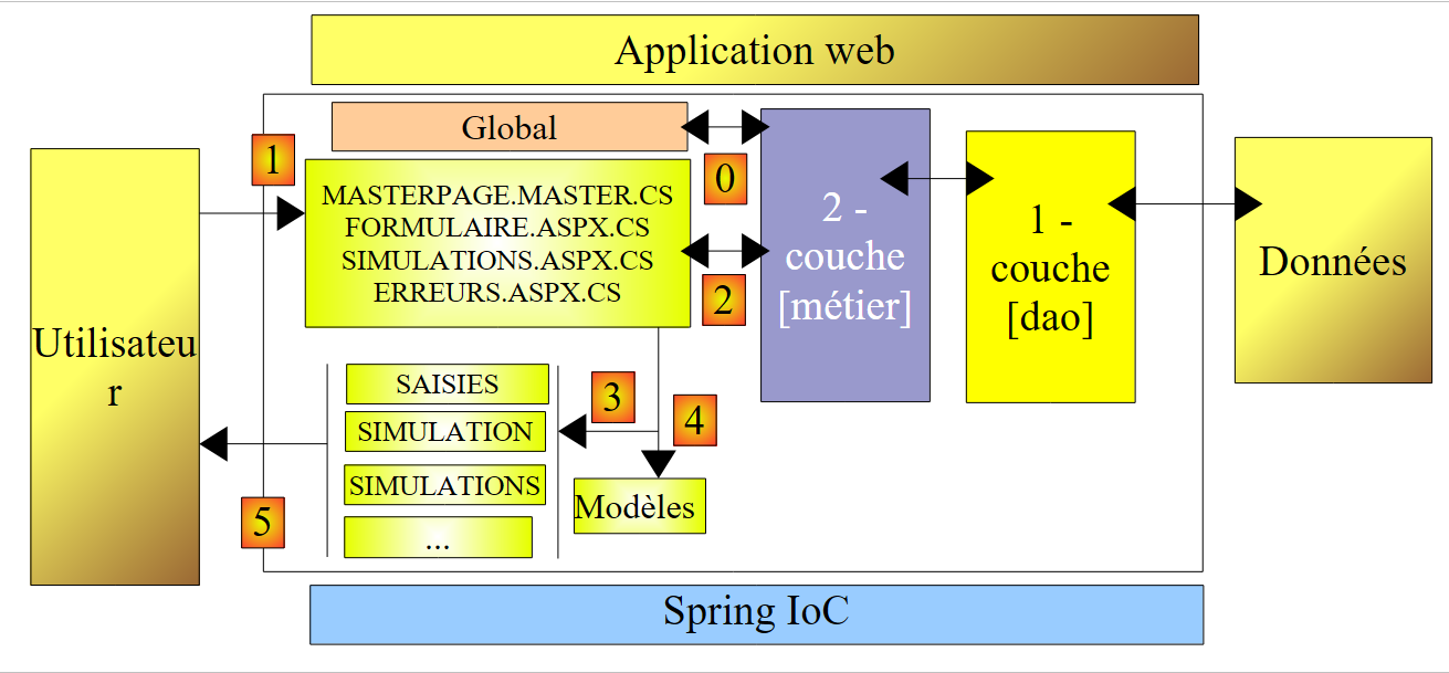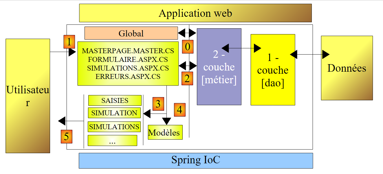 - le client fait une demande à l'application. Il la fait à l'une des deux pages [Formulaire.aspx, Simulations.aspx].