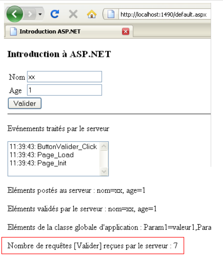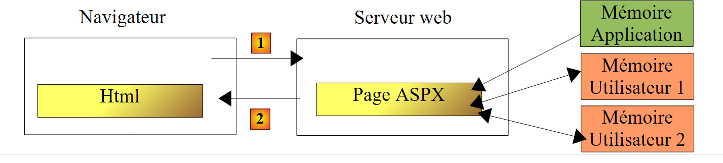 La classe associée à une page web, ici la classe Intro._Default, est créée au début de la requête du client et détruite lorsque la réponse au client a été envoyée. Elle ne peut donc servir à mémoriser des informations entre deux requêtes. Pour cela il faut utiliser la notion de session utilisateur.