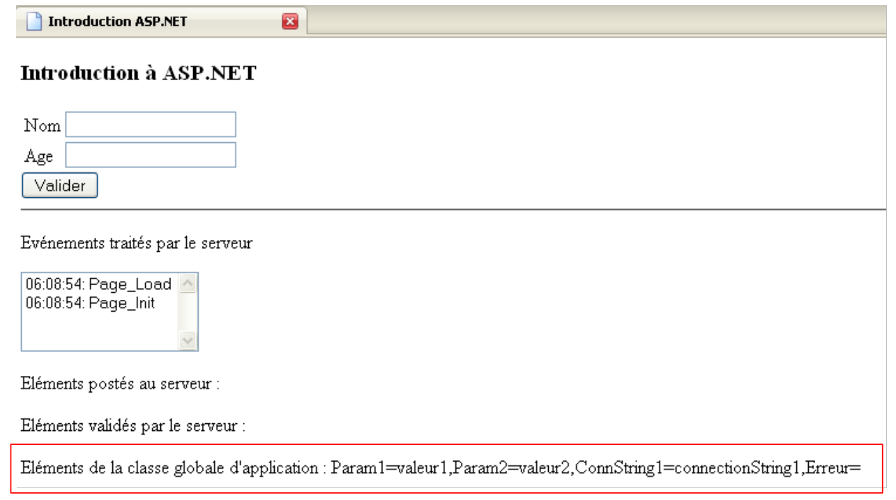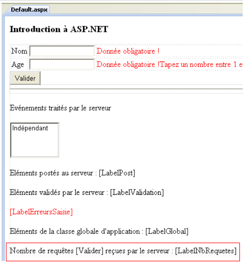 Ligne 9, le message mis par [Default.aspx] dans le contexte de la requête, est affiché dans Label1.