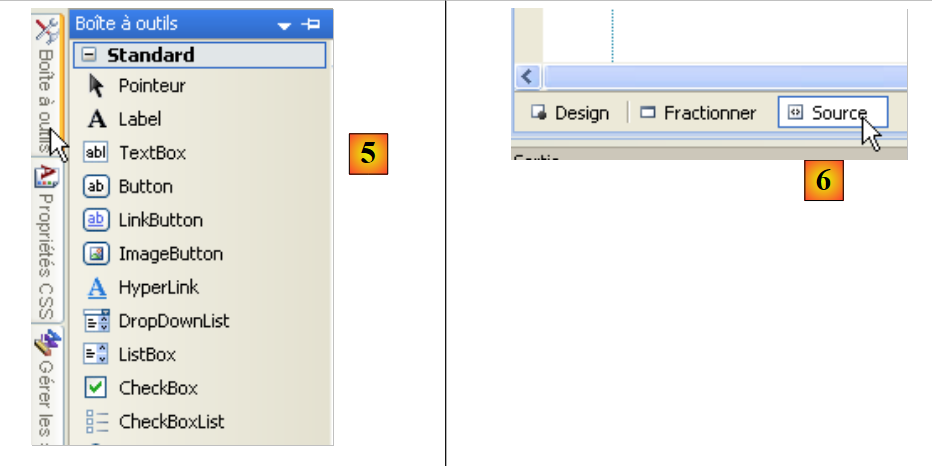 - en [4], la page [Defaul.aspx] en mode [Design]. On la construit en y déposant des composants que l'on trouve dans la boîte à outils [5].