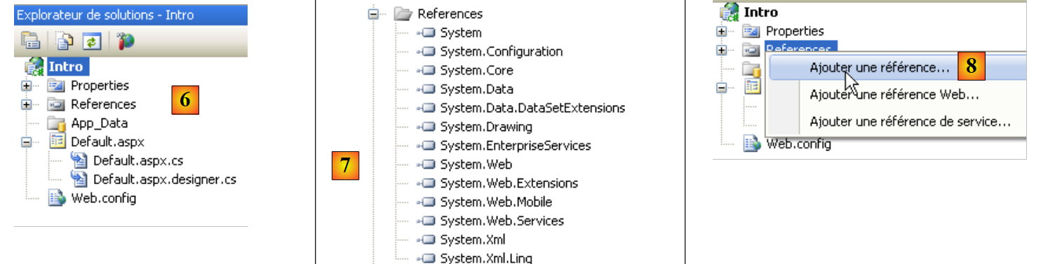 - [References] est la liste des DLL utilisées par le projet web. Ces DLL sont des bibliothèques de classes que le projet est amené à utiliser. En [7] la liste des DLL mises par défaut dans les références du projet. La plupart sont inutiles. Si le projet doit utiliser une DLL non listée en [7], celle-ci peut être ajoutée par [8].