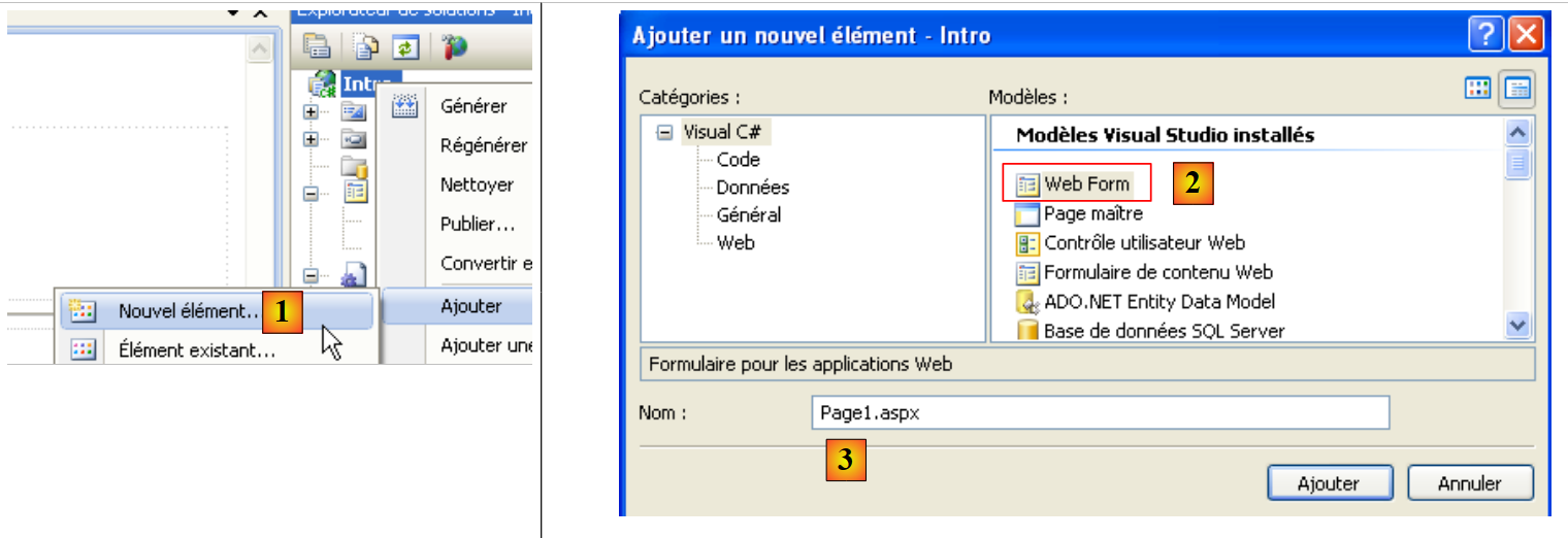 - en [2], on ajoute un élément [Web Form] nommé [Page1.aspx] [3]