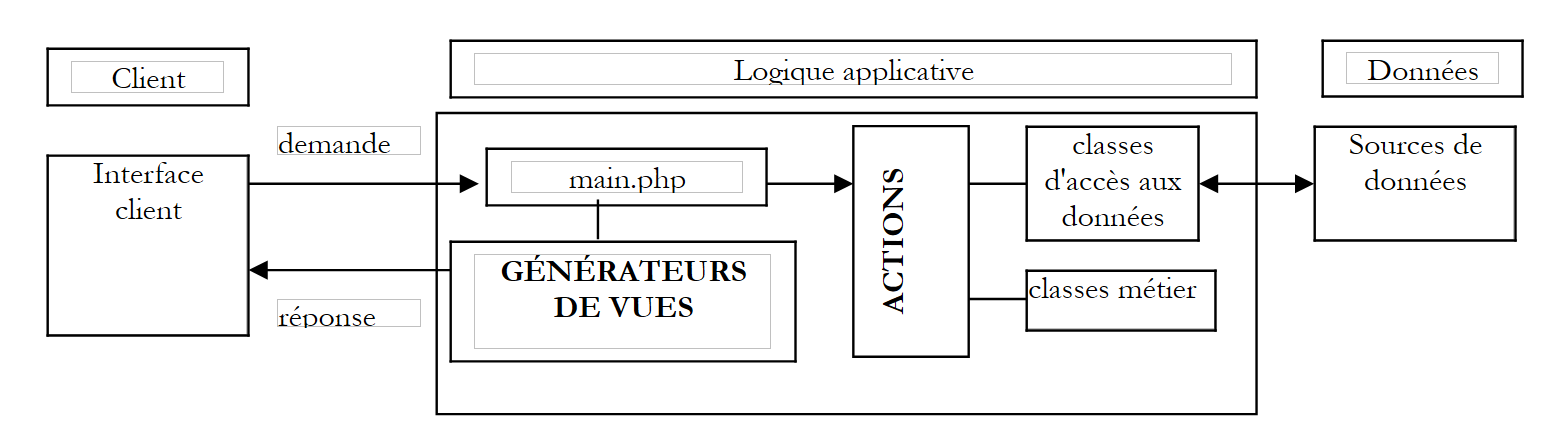 - le bloc [Classes d'accès aux données] qui regroupe les modules php qui obtiennent les données nécessaires au contrôleur, souvent des données persistantes (BD, fichiers, ...)