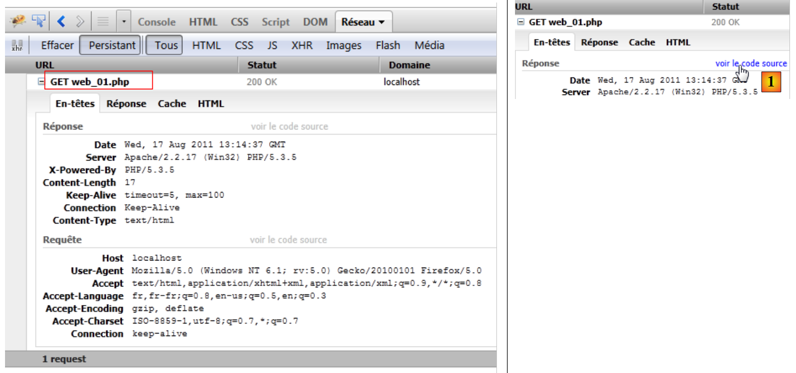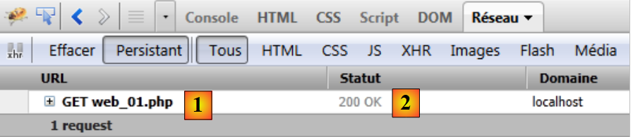 Pour découvrir les échanges client / serveur lors d'une requête HTTP, nous demandons l'URL [http://localhost/exemples-web/web_01.php] avec le navigateur Firefox. La fenêtre de Firebug se remplit alors d'informations :