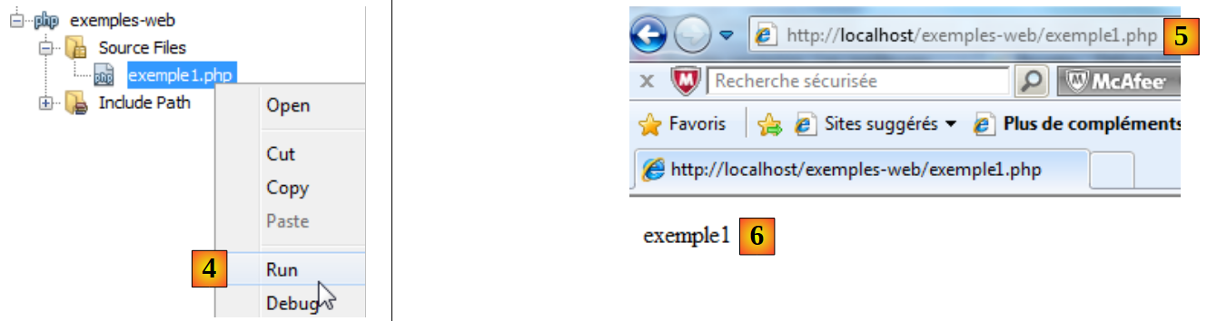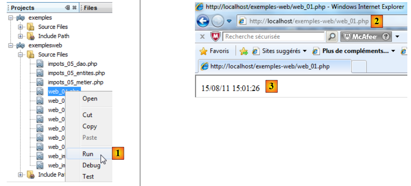 - en [4], nous exécutons le script web [exemple1.php]. Netbeans va alors lancer le navigateur par défaut de la machine et va lui demander d'afficher l'URL [http://localhost/exemples-web/exemple1.php] [5]