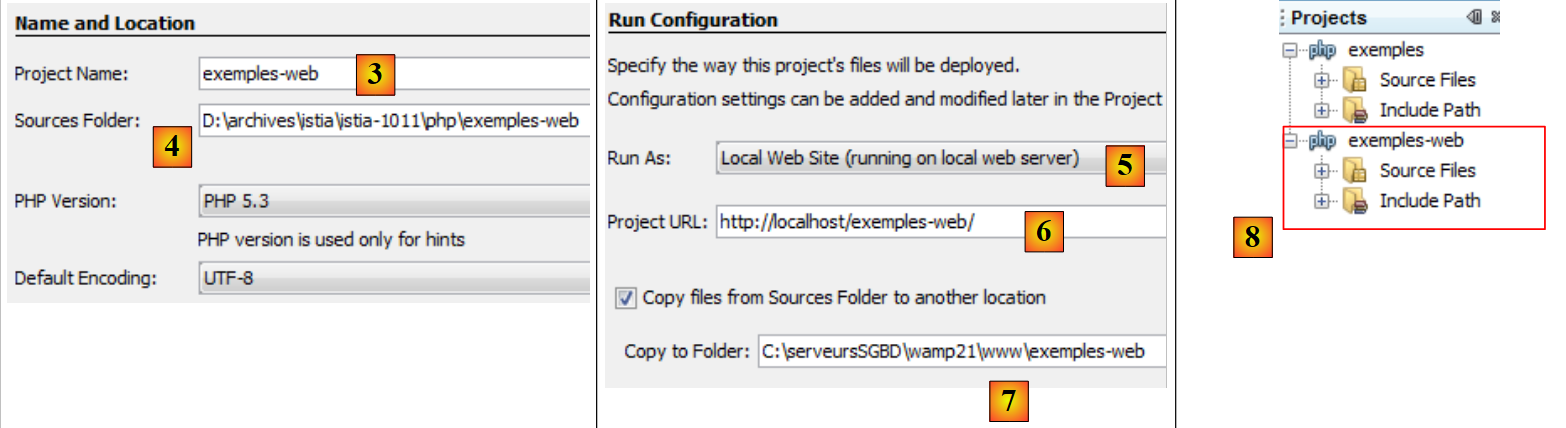 - en [6], nous donnons l'URL du projet. Ici, nous décidons qu'un script S.php du projet sera demandé avec l'URL [http://localhost/exemples-web/S.php]. D'après ce qui a été dit, cela veut dire que le chemin du script S.php dans le système de fichiers sera [<WampServer>/www/exemples-web/S.php]. C'est ce qui est indiqué en [7]. Nous demandons ici que tout script S.php du projet soit recopié dans l'arborescence du serveur web Apache.