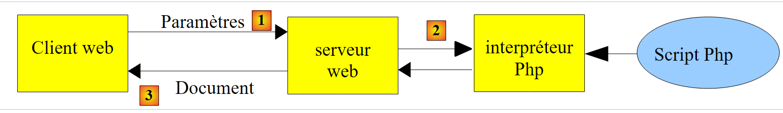 - en [2], le serveur web fait exécuter le script PHP par l'interpréteur PHP. Ce script génère un document qui est envoyé au client [3]
