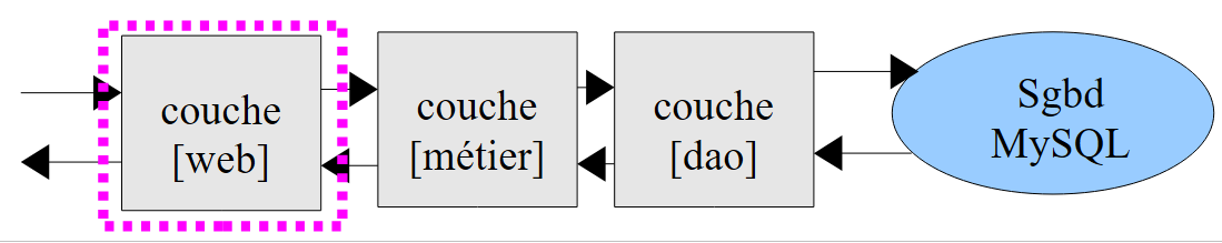 - lignes 30-40 : la référence sur la couche [métier] est mise en session. Si on se rappelle que cette couche [métier] a une référence sur la couche [dao] et que cette dernière mémorise les données du SGBD, on comprend alors :