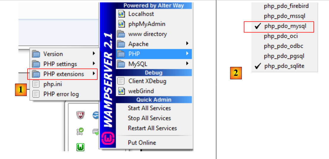 - 1 : à partir de l'icône d'administration de WampServer, on sélectionne l'option [PHP / PHP extensions]