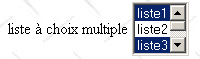 <select size="3" name="lst1"> <option selected>liste1</option> <option>liste2</option> <option>liste3</option> <option>liste4</option> <option>liste5</option> </select> | ![]() | lst1=liste3 - valeur choisie par l'utilisateur dans la liste à sélection unique |