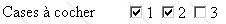 <input type="checkbox" name="C1" value="un">1 <input type="checkbox" name="C2" value="deux" checked>2 <input type="checkbox" name="C3" value="trois">3 |
