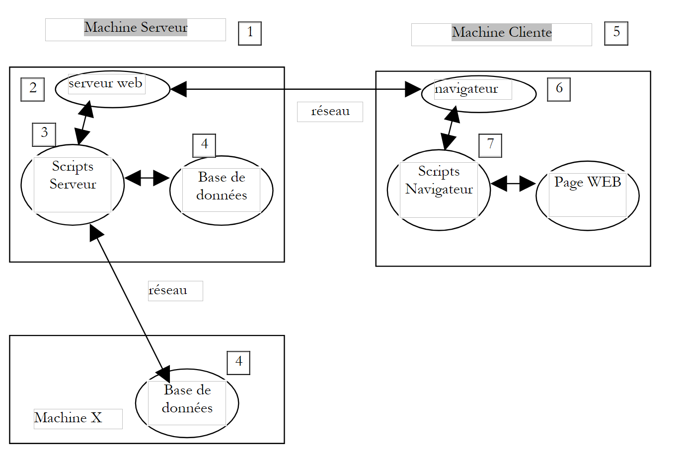 Scripts exécutés côté serveur. Ils peuvent l'être par des modules du serveur ou par des programmes externes au serveur (CGI). | PERL (Apache, IIS, PWS) VBSCRIPT (IIS,PWS) JAVASCRIPT (IIS,PWS) PHP (Apache, IIS, PWS) JAVA (Apache, IIS, PWS) C#, VB.NET (IIS) | |