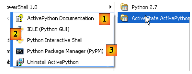 - 3 : le gestionnaire de packages d'Active Python. Nous nous en servirons pour installer le package Python permettant de travailler avec des bases de données MySQL.