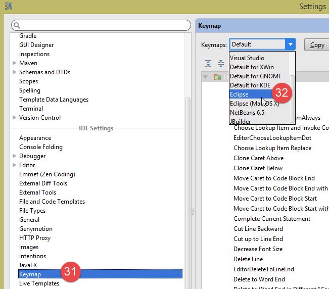 - en [28-32], choisissez le type de raccourcis clavier que vous souhaitez. Vous pouvez garder celui par défaut d'Intellij ou choisir celui d'un autre IDE auquel vous seriez plus habitués ;