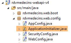 Il faut par ailleurs configurer l'application web. En l'absence de fichier [web.xml], cela se fait avec une classe héritant de [SpringBootServletInitializer] :