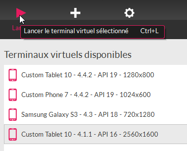 Ci-dessus, on lance un émulateur de tablette avec l'API 16 d'Android. Une fois l'émulateur lancé,