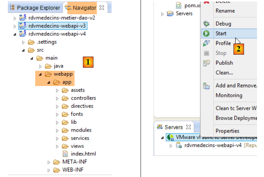 Dans STS, copions tout le contenu du dossier [rdvmedecins-angular-v3/app] dans le dossier [webapp] du projet [rdvmedecins-webapi-v4] (onglet Navigator) [1] :