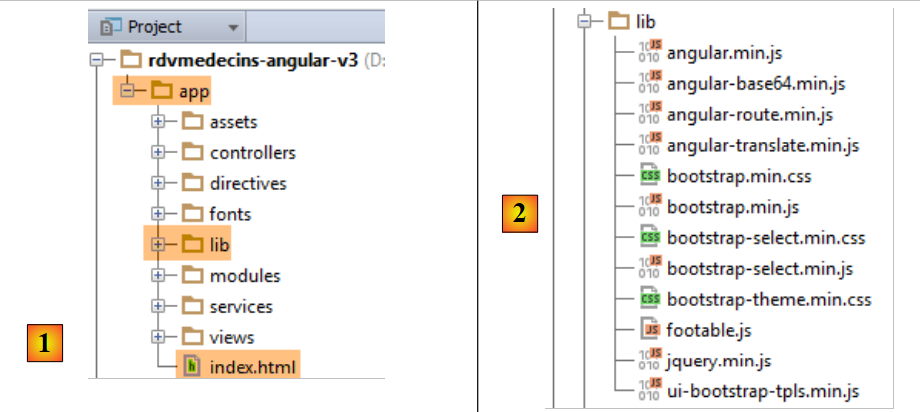 - en [1], on a supprimé le dossier [bower-components] qui contenait les diverses bibliothèques CSS et JS nécessaires au projet. Tous ces éléments ont été recopiés dans le dossier [lib] [2] ;