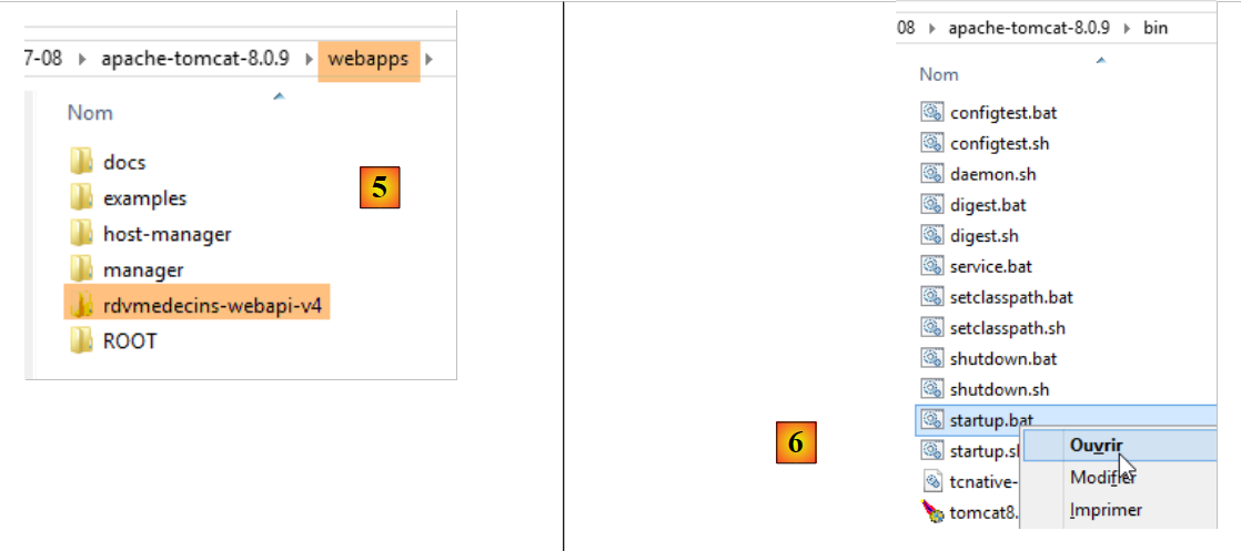 - en [5], on colle le dossier [rdvmedecins-webapi-v4] dans le dossier [webapps] de Tomcat ;