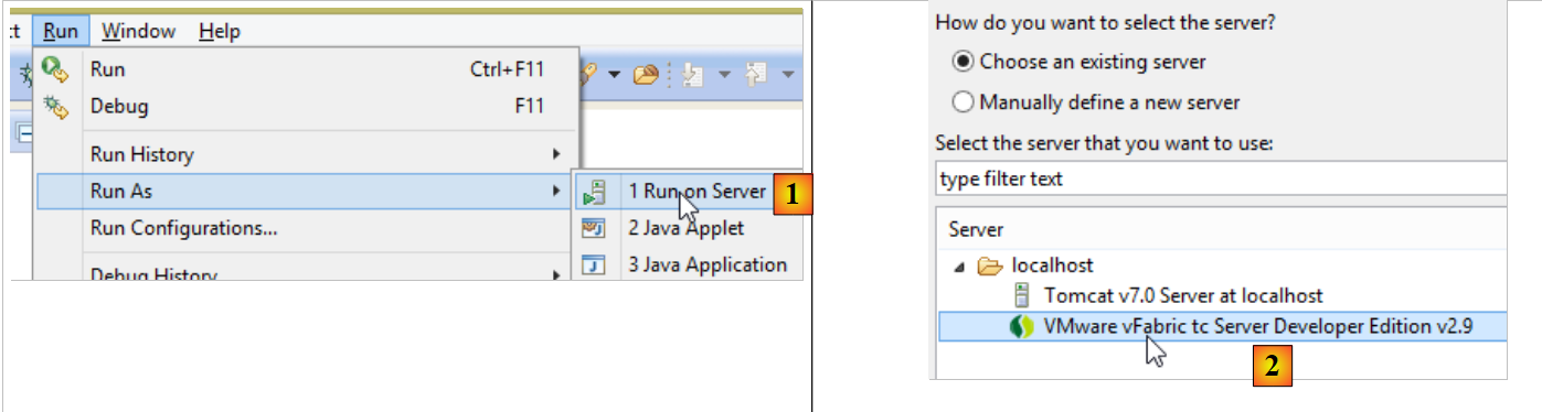 - en [1], on exécute le projet sur l'un des serveurs enregistrés dans l'IDE Eclipse ;