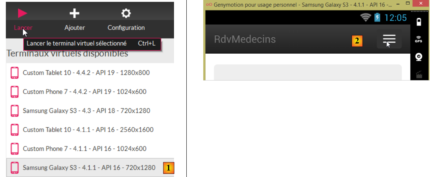 Lancez un émulateur [GenyMotion] pour une tablette Android (voir paragraphe 6.4) :